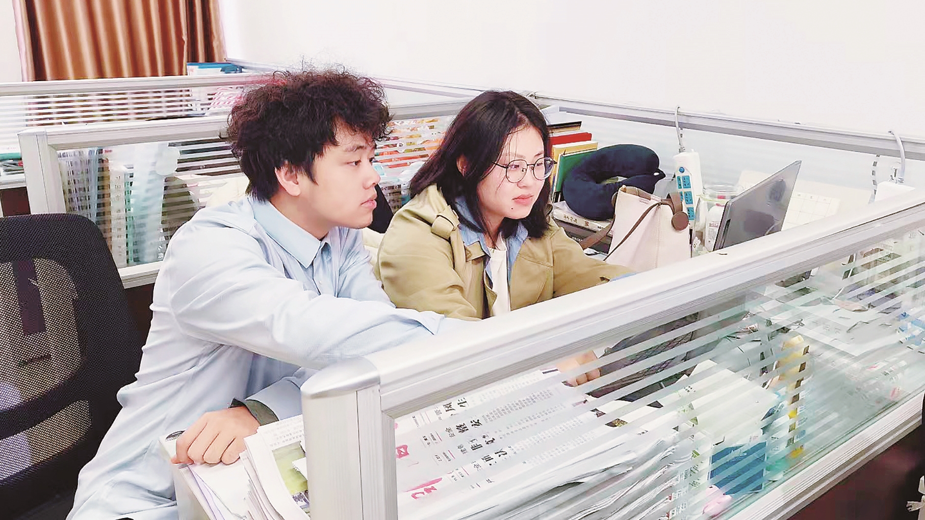 ▲唐红彬(左)和曾艳正在讨论视频文案。