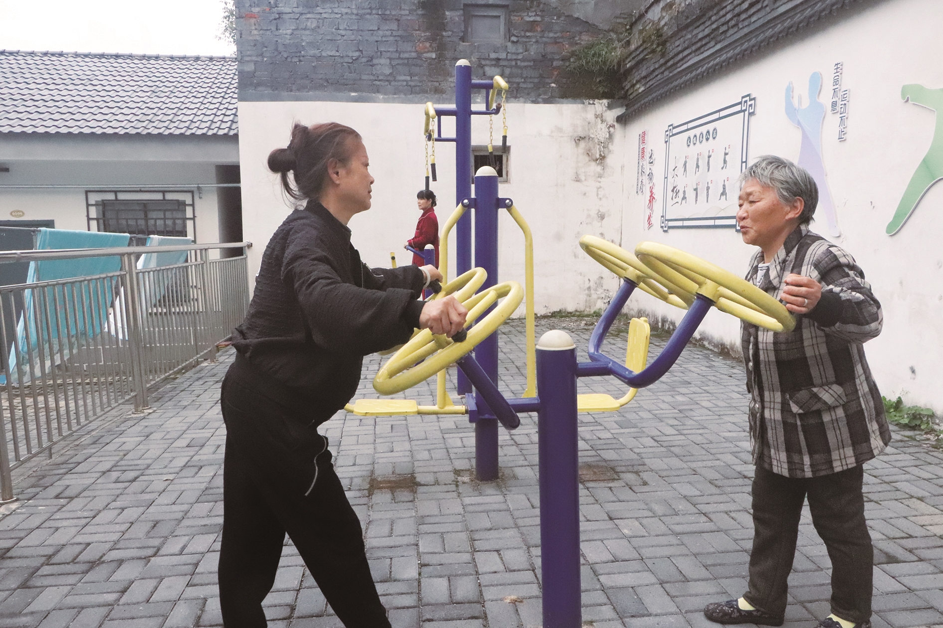 ▲临津门直管公房片区改造后,增设了健身器材,居民们锻炼身体更方便了。陈贻贵 摄